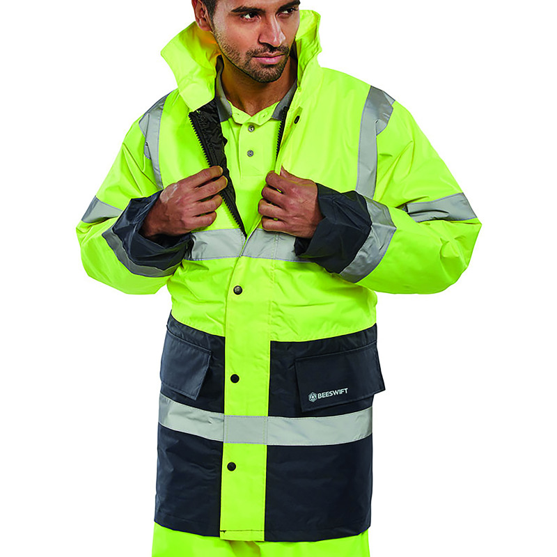 * Heavyweight PU coated polyester.* Quilted lining with polyester filling. * Concealed hood.* Two-way heavy duty zip front.* 2 lower pockets.* 1 inside pocket.* Knitted storm cuffs. * Fully taped seams.* Retro-Reflective Tape.* EN ISO 20471 Class 3 High Visibility* EN 343 Class 3 resistance to Water Penetration Class 1 Air Permeability